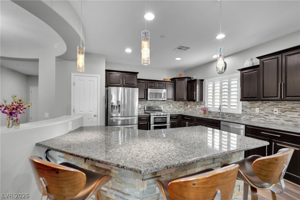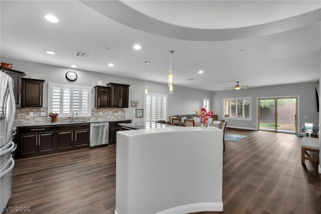 Welcome to your dream residence in the desirable Madeira Canyon community! This beautifully upgraded single-story home features a spacious open floor plan, perfect for modern living. Enjoy the luxury of vinyl plank flooring throughout, enhancing both style and durability. The gourmet kitchen boasts a large island with a breakfast bar, stunning granite countertops, and sleek stainless steel appliances, ideal for culinary enthusiasts.Retreat to the primary bedroom, thoughtfully separated from the other bedrooms for added privacy. The primary bath offers a dual sink vanity, separate tub and shower, and a generous walk-in closet. Step outside to a private backyard oasis with a covered patio, perfect for outdoor entertaining. Additional features include a 2-car attached garage, stylish shutters, and ceiling fans throughout. Don't miss out on this exceptional home!